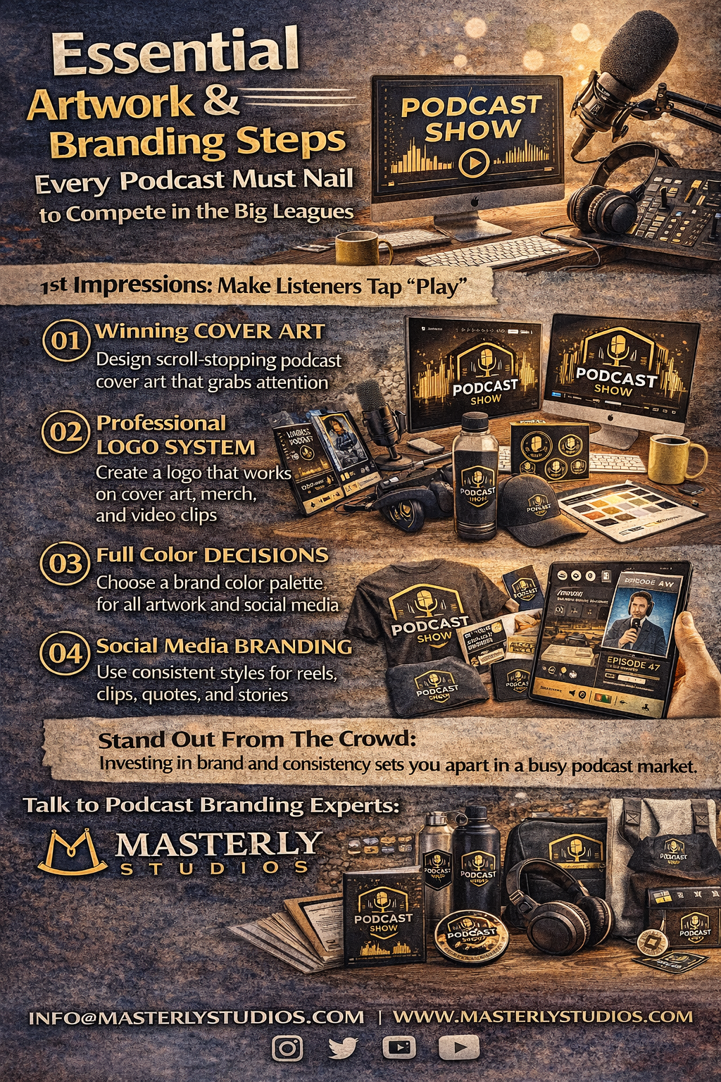 If you’re serious about b uilding a podcast that looks professional, attracts the right audience, and holds listener attention, don’t leave your visuals to chance. The smallest details—cover art readability, logo consistency, full color choices, and the quality of your promotional items—can influence clicks, ranking signals, and listener retention. Masterly Studios helps creators develop podcast branding that feels intentional, consistent, and ready for real business growth, including promotional materials and branded product strategies that help your audience remember you.To book a free consultation, contact Masterly Studios at (888) 209-4055 . We work with clients throughout the country and nationally, and we’d love to help you sharpen your brand identity, upgrade your artwork, and build promotional products that make your podcast stand out.