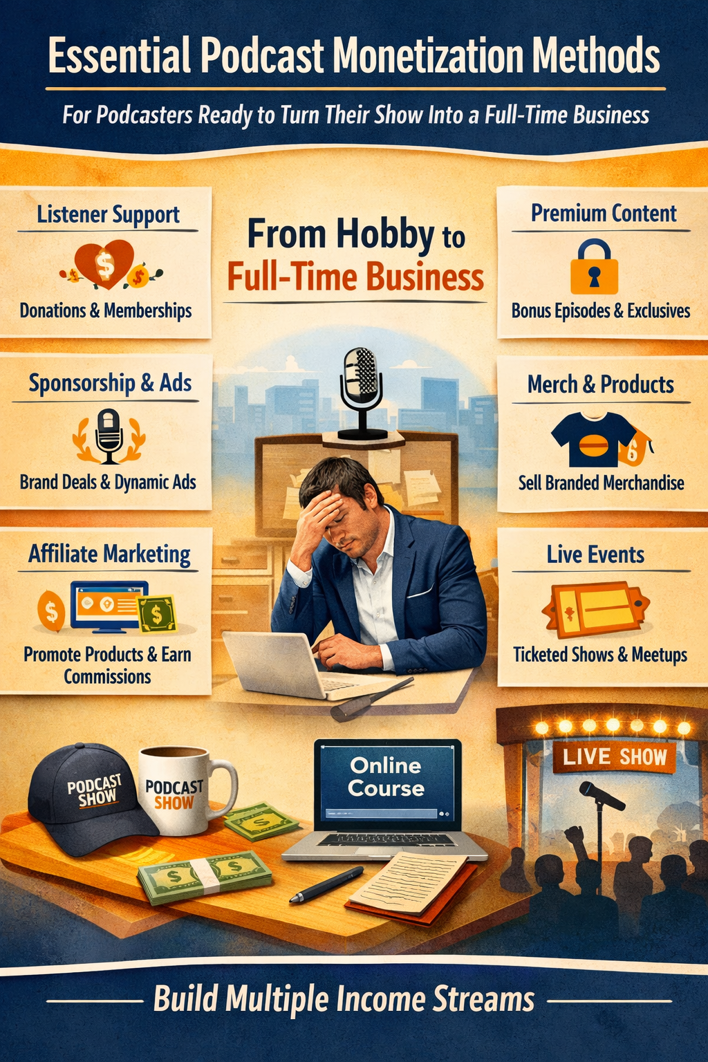 The mos t stable podcasts rely on multiple revenue streams working together. This means combining listener support, sponsorships, and product sales into one cohesive strategy.By diversifying your income sources, you reduce risk and create opportunities for more revenue over time. This approach is key to turning your podcast into a full-time business.