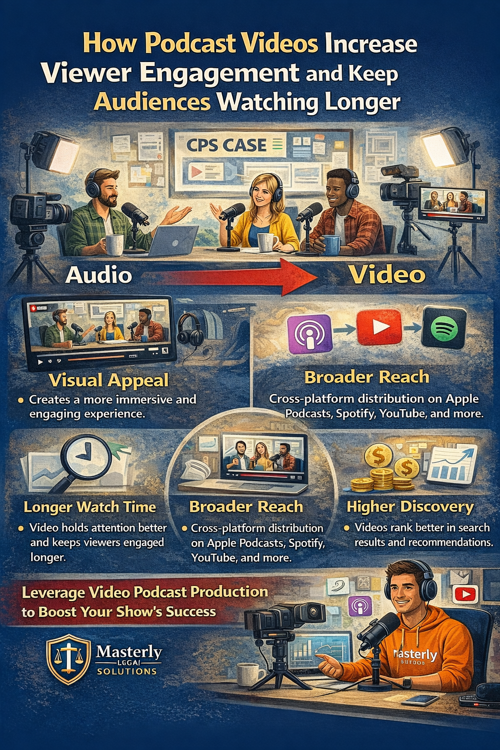 If you are ready to transform your podcast into a powerful video podcast that drives engagement and increases revenue, we are here to help. At Masterly Studios, we guide creators through every step of the process—from production and podcast hosting to distribution across Apple Podcasts, Spotify, YouTube, and other platforms.We understand attention-retention trends and how video dramatically improves discovery metrics. Our team works with clients nationally to create compelling video shows that keep viewers watching longer and build lasting subscriber growth.