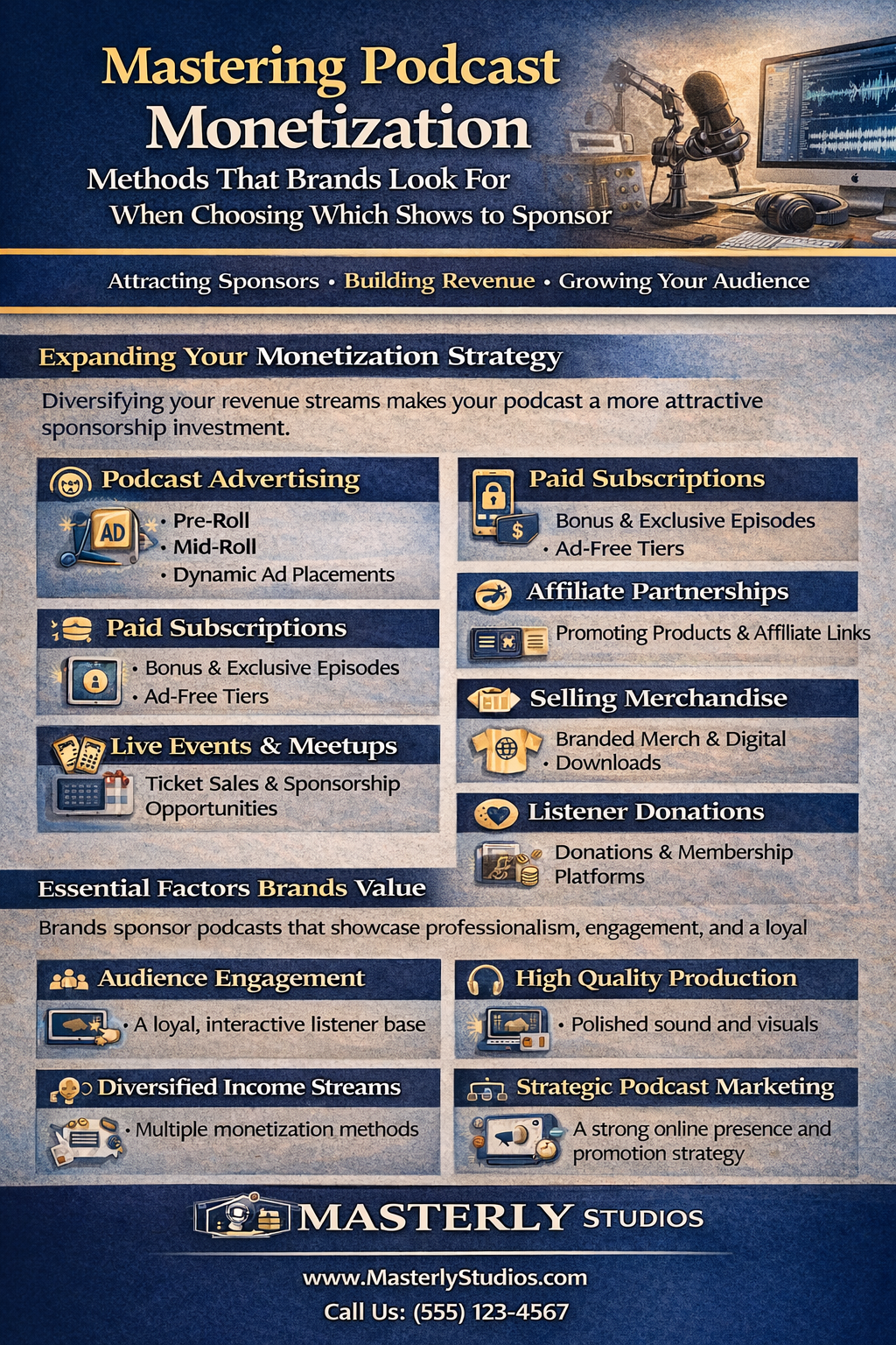 If you want clarity on how to monetize a podcast and position your show for real sponsorship opportunities, we are here to help. Whether you are just beginning your podcasting journey or aiming to become a full time podcaster, strategic guidance makes all the difference.At Masterly Studios, we help creators refine their monetization strategy, improve production, and prepare for meaningful sponsorship deals. We work with clients throughout the country and nationally to elevate their podcast brand.