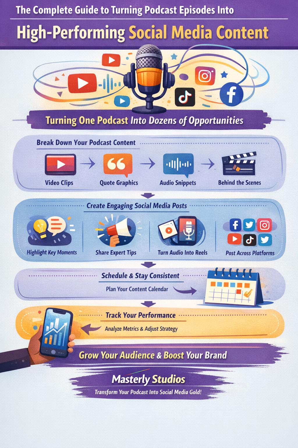 Ever y podcast episode you record holds far more value than a single upload on apple podcasts or your hosting platform. Most creators spend hours planning, recording, and editing their episodes, but only a fraction of that effort is used to grow their brand across social media. That gap is where opportunity lives. Repurposing your podcast into high-performing content can completely change how your brand shows up online.At Masterly Studios, we work with creators, businesses, and marketers who want to maximize their time while improving their results in social media marketing. Instead of constantly trying to create new content from scratch, you can turn one podcast into a full plan of posts, clips, and visual assets. This approach not only saves time but also helps you stay consistent in an ever changing marketing jungle where attention shifts quickly.