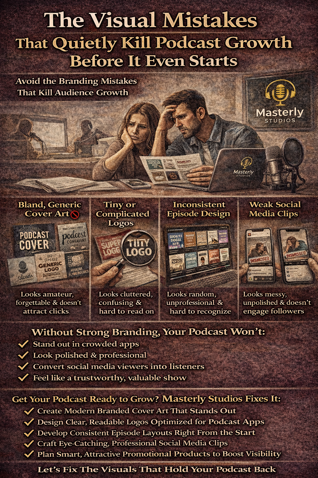 At Masterly Studios, we’ve worked with creators, small business owners, non profit teams, and successful business owners who had strong ideas and valuable insights—but their visual presentation kept the podcast from becoming a trusted resource. The good news is that most visual mistakes are fixable fast, especially when you stop guessing and use a repeatable marketing strategy. This article breaks down what goes wrong, why it matters, and how our workshop helps you build a branded podcast that looks professional, consistent, and ready to promote across every platform.